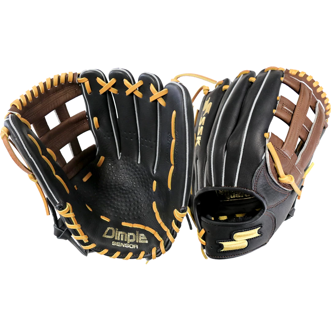 Introducing the newest SSK glove. The Highlight Pro Series features the patented Dimple Sensor Technology. Padded Shock Guard for extra palm protection. Made of top grain steerhide leather for durable, lightweight, soft, quick break-in. “Fabric” finger stalls for added comfort and with moisture-wicking properties to avoid slippage.
