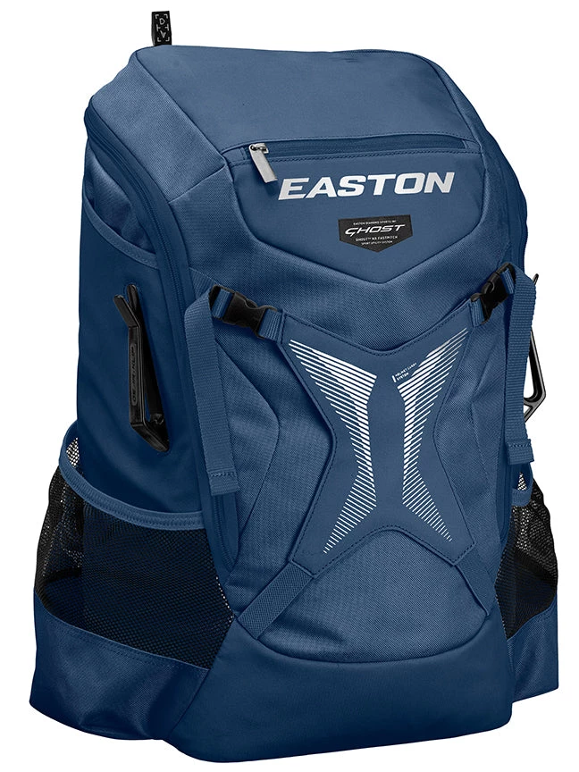 The Easton Ghost NX fastpitch backpack is essential for softball players looking to carry their gear to games and practices in style. Featuring an extra-wide main compartment with large zippers, this backpack is durable and has more than enough room for your equipment. The exterior of the bag has a metallic-printed helmet holder, allowing for more space inside and additional dry time for your helmet. Patent pending Gear Klips on the sides are perfect for holding a pair of cleats, ball gloves, batting gloves, or other gear. In addition, the NX backpack has 2 full-length bat sleeves to protect them during travel. The expandable mesh pockets on the side accommodate oversized water bottles while the front personal pocket keeps valuables within reach, but out of sight. Female-specific padded back and shoulder straps make carrying this backpack a comfortable experience. When you reach the dugout, the tuck-away fence hook allows you to hang your bag off the ground and at arms reach.