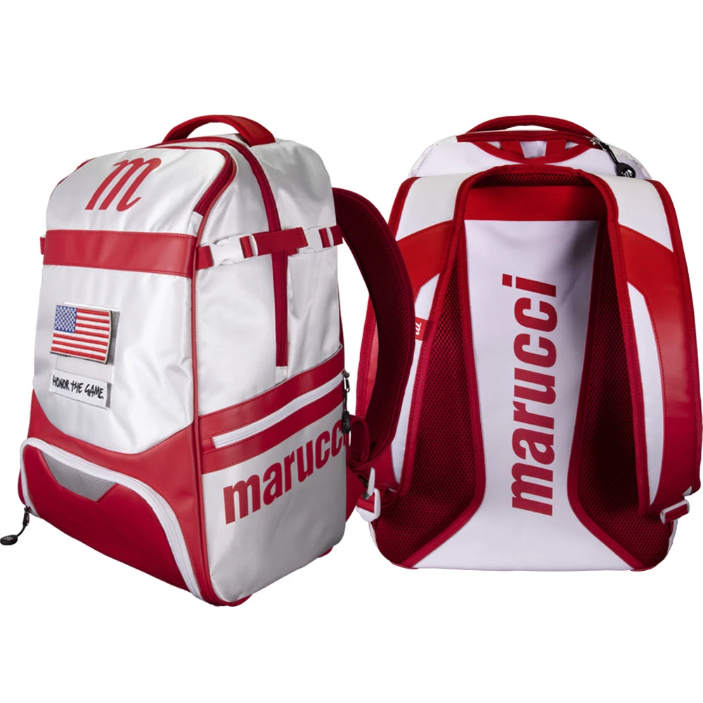 Carry all your gear easily with the all-new Marucci Dynamo Baseball Equipment Backpack. The Dynamo Bat Pack is designed to keep your gear organized, perfect for travel, game day, or school. Each Dynamo Bat Pack comes standard with Honor the Game and USA Flag removable patches and can easily be personalized with additional Marucci patches. The side bat holders provide secure protection for up to four bats with 2 3/4″ barrels. In addition, the Dynamo showcases a fleece-lined side zipper laptop sleeve, a fleece-lined top drop pocket for safe storage for valuables, and a fleece-lined sunglass case that protects against scratches and breakage. A molded fence hook allows you to hang your bag for easy in-game access, while the ventilated cleat compartment helps keep your gear protected from unwanted odors or filth. Make your move with the Marucci Dynamo Baseball Equipment Backpack